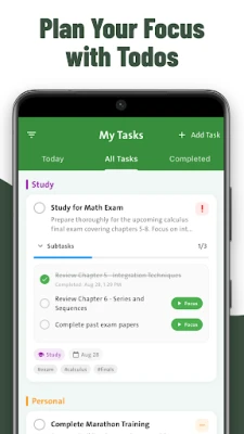 Built-in To-Do List – Create tasks, subtasks, set priorities, and link them directly to your focus sessions.