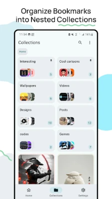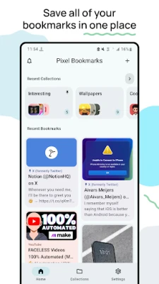 Organize bookmarks using custom collections and nested collections. Build a structure that fits your workflow and keep your saved content clean and easy to browse. Use tags to further categorize and filter your bookmarks for fast access.