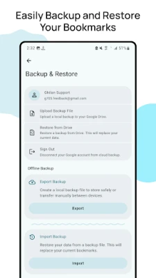 Your bookmarks are protected with both local backup and Google Drive support. Easily restore your saved links on any device, and never worry about losing your collections or customizations.