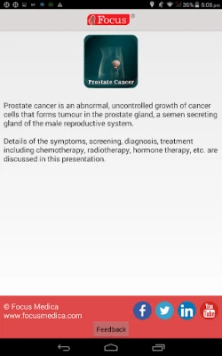 Prostate Cancer- An Overview - helps in understanding the disease condition through ANIMATED VIDEOS. This app explores the anatomy of the prostate gland. Understand symptoms, causes, risk factors, staging and prognosis, diagnostic methods and evaluation of prostate cancer and treatment options including recent advances in treatment using this App.